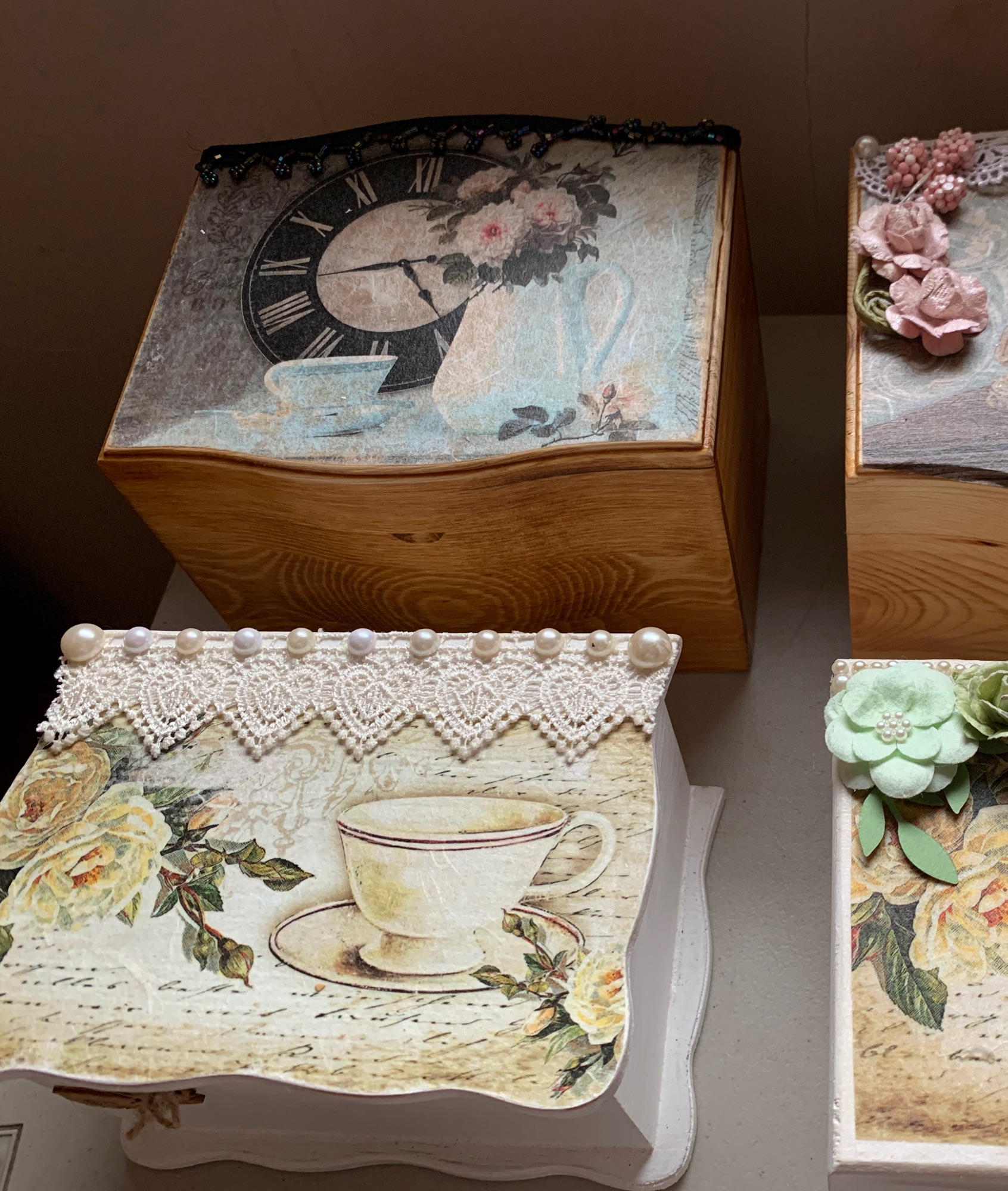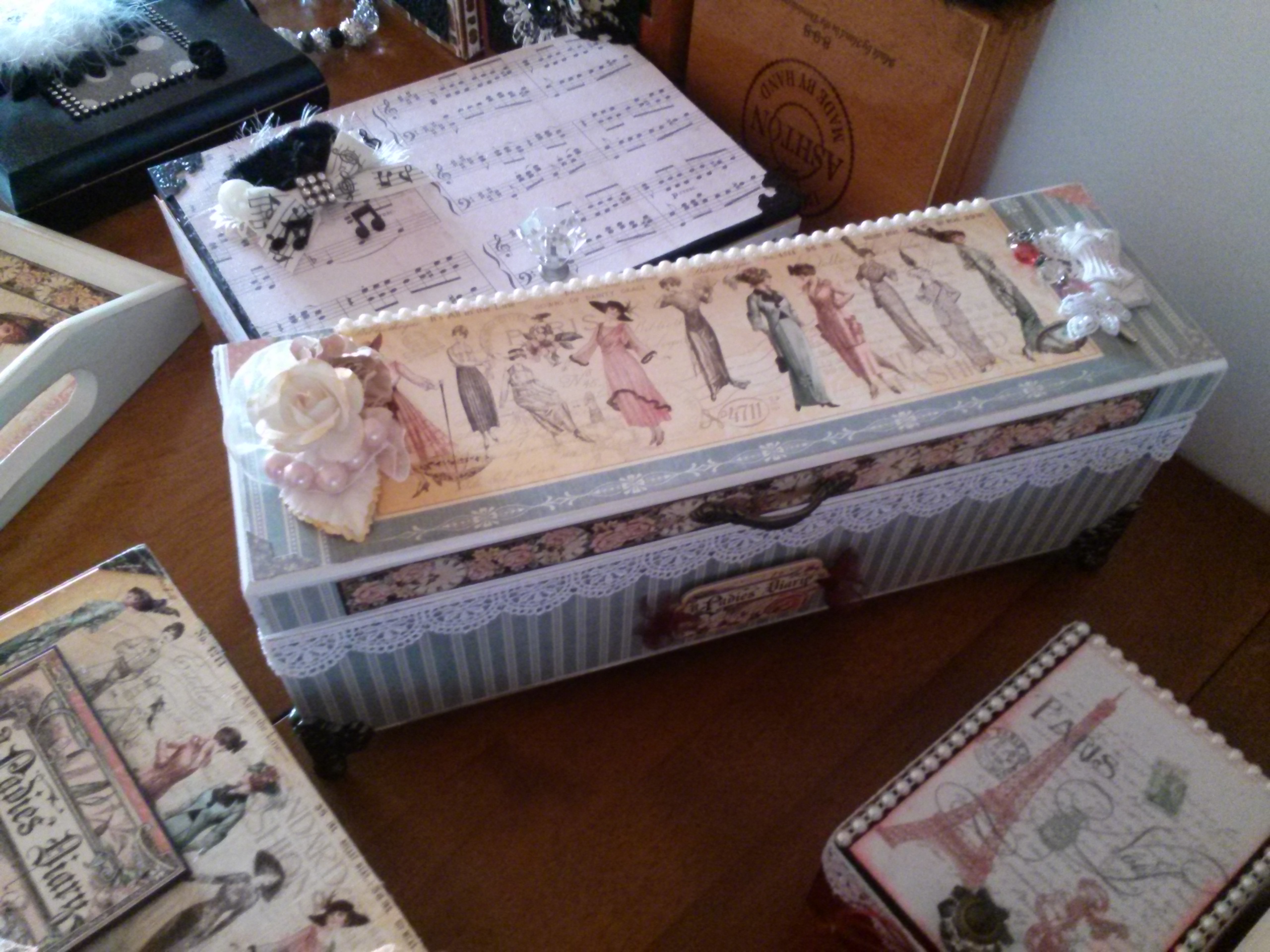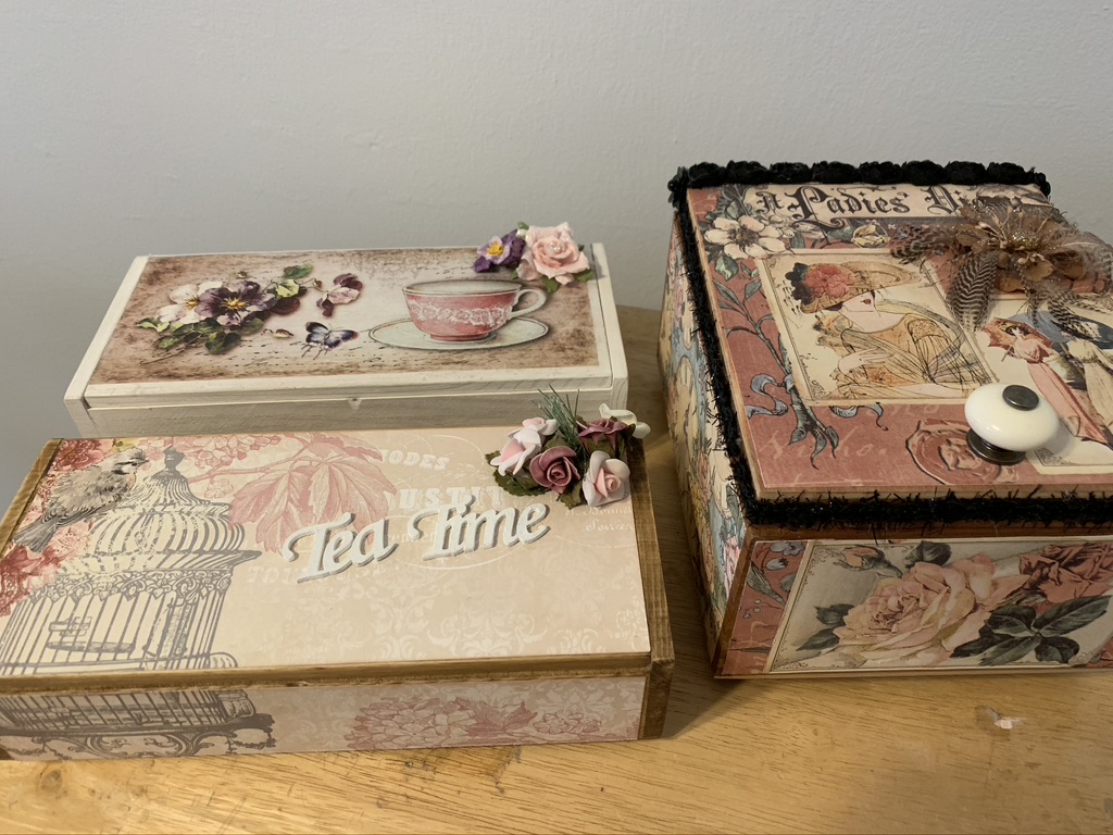 I always have lots of different types of Boxes. Nautical, Tea, Vintage and Victorian Women. These are a few of my creations: